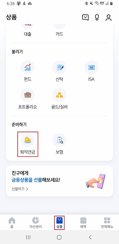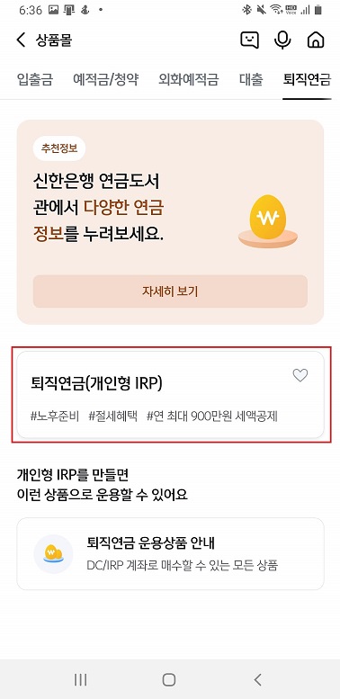 1. 쏠 앱 실행 후 상품 메뉴에서 퇴직연금을 선택합니다.
