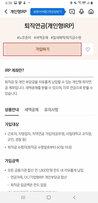 2. 개인형 IRP 선택 후 가입하기를 누릅니다.