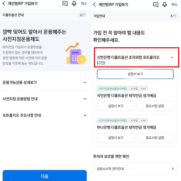 5. 디폴트 옵션에서 초저위험 포트폴리오를 선택합니다.
