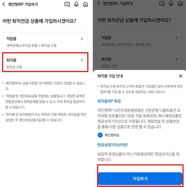 4. 퇴직용을 선택하고 가입하기 진행합니다.