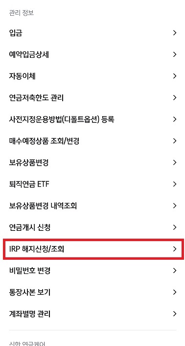 - 쏠 앱에서 '계좌 관리'로 들어가 'IRP 해지신청/조회'를 선택합니다.